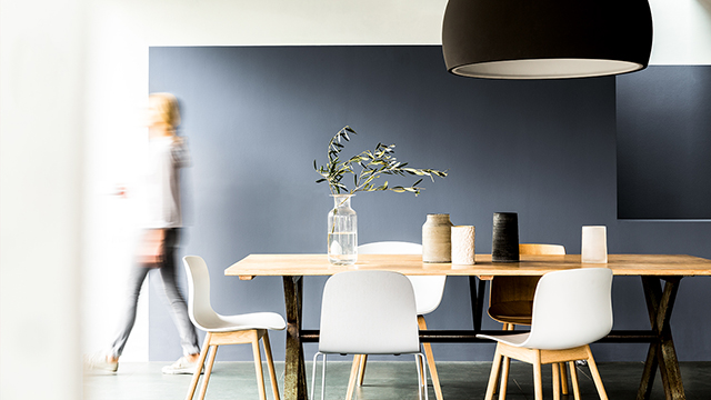 Trong hình trên, một khối màu xanh dương rực rỡ làm nổi bật khu vực ghế sofa trong phòng khách, trong khi sử dụng Màu Nâu Mật Nồng nhiều hơn, sẽ mang lại sự thực tế cho khu vực làm việc liền kề. Đồ nội thất đơn giản và chậu cây xanh mát trong nhà cho không gian thêm hoàn thiện và tương sáng.