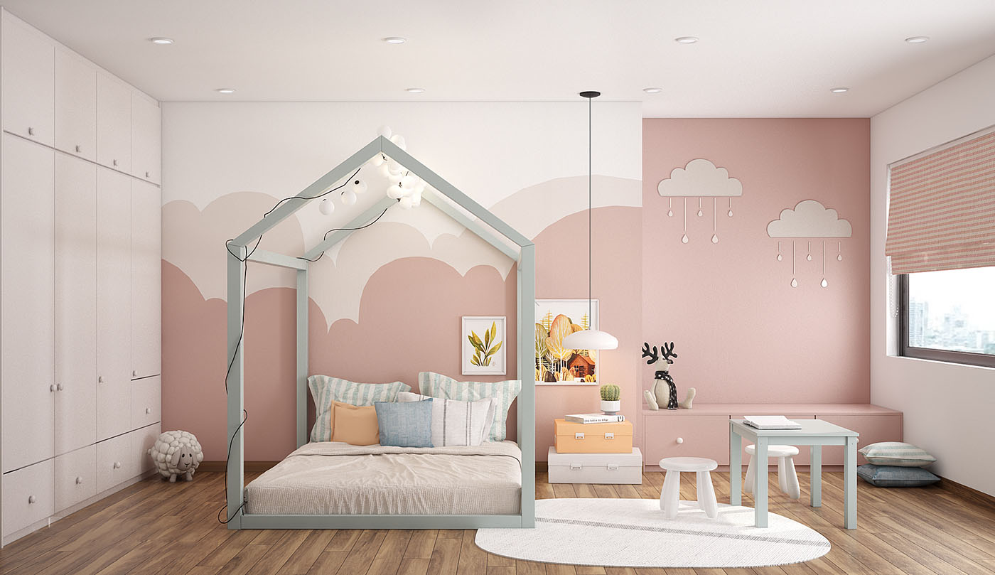 Trong không gian phòng ngủ nhẹ nhàng này, tâm trạng tích cực sẽ luônchiếm ưu thế, suốt 365 ngày một năm. Cảm xúc nhẹ nhàng mang lại từ sự kết hợp của màu hồng tươi cùng với một vòng tròn họa tiết màu cam tươi vàc các chi tiết được sơn bởi Màu Nâu Mật Nồng mang lại một màu sắc thực. Các đồ trang trí hiện đại, mát mẻ và bộ khăn trải giường làm tăng thêm bầu không khí trẻ trung tươi mới cho cả căn phòng.